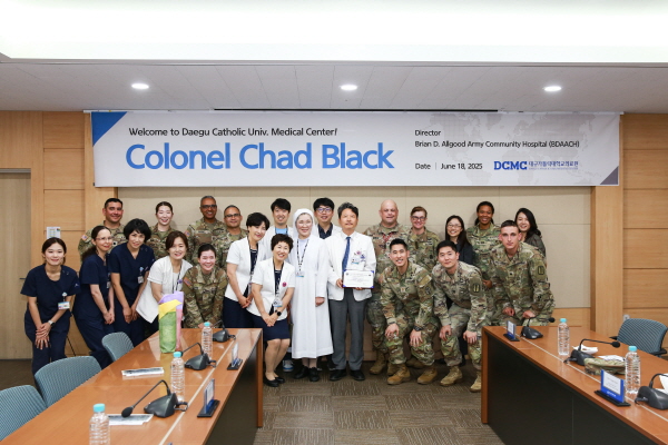 (경북=NSP통신) 김대원 기자 = 대구가톨릭대학교병원(병원장 김윤영)은 지난 18일 주한미군 평택 캠프험프리(Camp Humphreys) 병원장 및 관계자들이 본원을 방문해 간담회를 갖고 한미 간 진료 협력 체계 강화와 신뢰 관계 구축을 위한 다양한 논의를 진행했다.