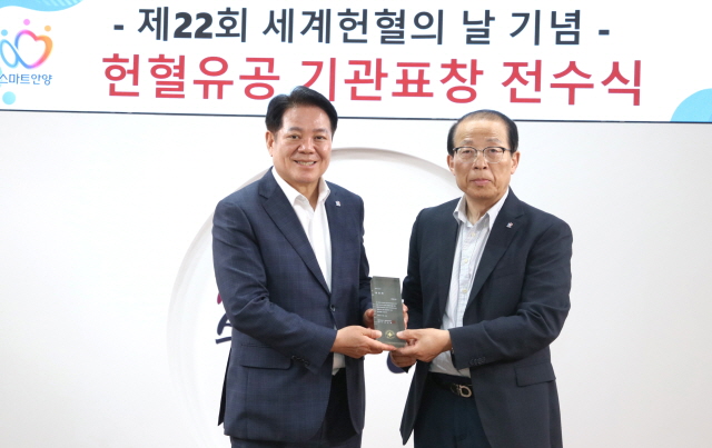 NSP통신-안양시가 세계헌혈자의 날을 맞아 헌혈유공 기관표창을 수상했다. 사진은 최대호 안양시장(왼쪽)과 김순기 동안구보건소장의 전수식 기념촬영 모습. (사진 = 안양시)