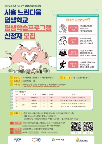 (경기=NSP통신) 서국현 기자 = 경기 시흥시(시장 임병택)는 2025년 경계선 지능인 평생교육 지원사업인 ‘시흥 느린다움 평생학교’의 선별검사에 이어 23일부터 7월 16일까지 평생학습 프로그램 참여자를 모집한다.