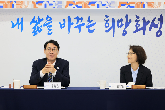 24일 정명근 화성시장(왼쪽)과 이미라 산림청 차장이 ‘화성형 休 숲 프로젝트’ 업무협약 식에서 환담을 나누고 있다. (사진 = 화성시)