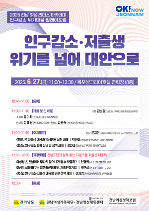 포럼에서는 △경북지역 저출생 대응과 양성평등 실천 과제 △전라남도 인구감소 현황 진단 및 정책 과제 등 두 가지 주제 발표를 통해 타지역과의 비교 및 전남의 현황을 함께 짚어본다.
