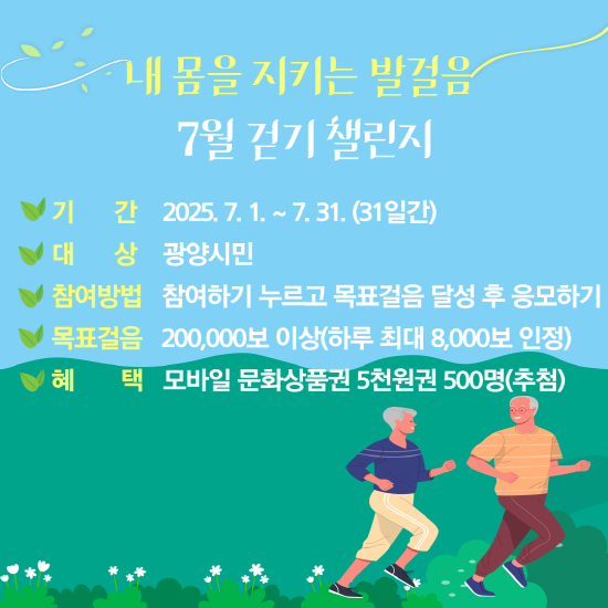 (전남=NSP통신) 김성철 기자 = 광양시는 오는 7월 1일~31일까지 모바일 걷기 애플리케이션 ‘워크온(WalkOn)’을 통해 ‘내 몸을 지키는 발걸음 7월 걷기 챌린지’를 운영한다고 밝혔다.