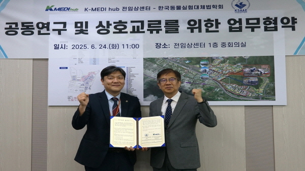(경북=NSP통신) 김대원 기자 = 케이메디허브(대구경북첨단의료산업진흥재단, 이사장 박구선) 전임상센터와 한국동물실험대체법학회가 지난 24일 국제적 수준의 첨단 동물대체시험법 개발 및 연구지원을 위해 업무협약(MOU)을 체결했다.
