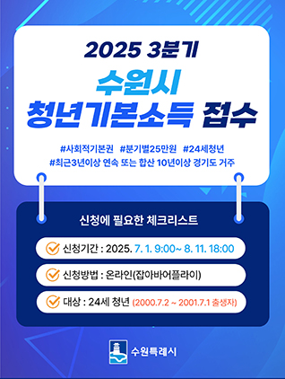 (경기=NSP통신) 조현철 기자 = 경기 수원시(시장 이재준)가 7월 1일 오전 9시부터 8월 11일 오후 6시까지 24세 청년을 대상으로 ‘2025년 3분기 청년기본소득’ 신청을 받는다.