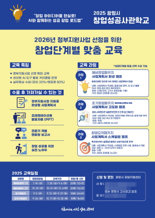(경기=NSP통신) 김여울 기자 = 경기 광명시(시장 박승원)는 2026년 정부지원사업 선정을 준비하는 예비·초기·도약기 창업자를 대상으로 ‘2025 광명시 창업성공사관학교’ 교육생을 모집한다.