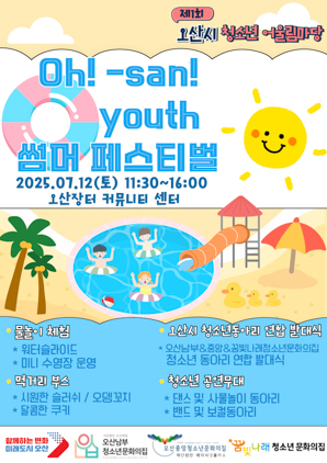 오산시 청소년 동아리 연합회 발대식과 함께 진행되는 본 축제에서는 ▲오산장터 커뮤니티센터 외부 광장에 설치되는 대형 워터 슬라이드 ▲청소년 동아리 공연 ▲다양한 먹거리 부스 등, 청소년은 물론 전 세대가 즐길 수 있는 다채로운 프로그램이 마련될 예정이다.