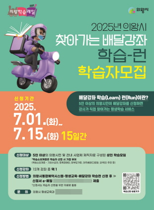 (경기=NSP통신) 김해종 기자 = 경기 의왕시(시장 김성제)는 사각지대 없는 평생학습 문화 확산을 위해 시민이 원하는 시간과 장소에서 평생학습 강좌를 수강할 수 있는 배달 강좌 ‘학습-런’의 참여자를 모집한다.