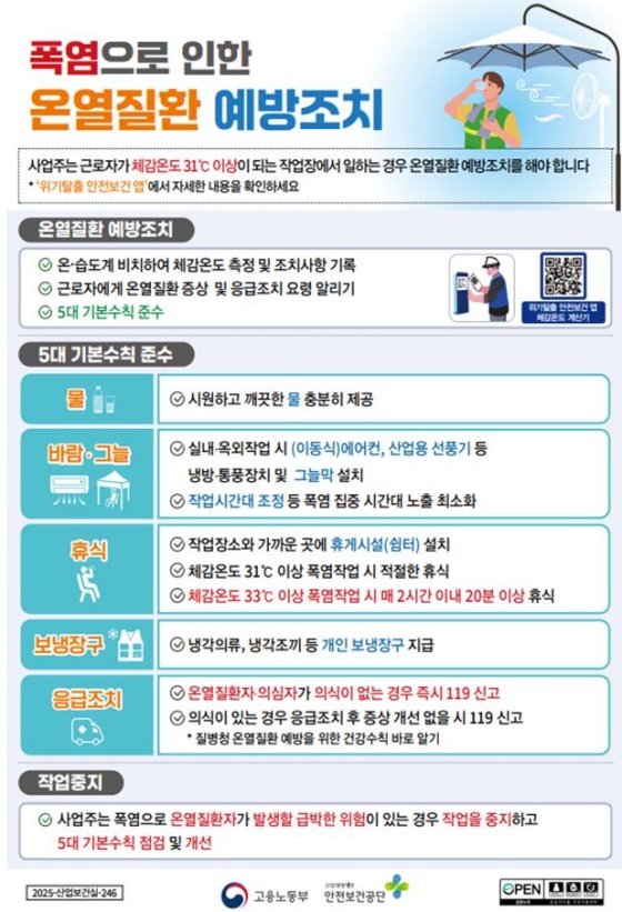 올여름 강한 폭염이 예상되는 상황임을 감안해 건설․물류․농업 등 폭염 고위험 사업장에 대해 더욱 경각심을 갖고 ‘2시간마다 20분 이상 휴식 부여’ 등 폭염안전 5대 기본수칙 준수를 집중지도하고 있다.