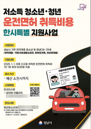 한편 성남시가 올해 상반기 35명의 저소득 청소년과 청년에게 지급한 운전면허 취득비용은 1인당 50만원씩 총 1750만원이다.