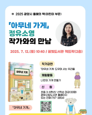 (전남=NSP통신) 김성철 기자 = 광양시는 오는 7월 12일 오전 10시 40분 꿈빛도서관에서 초등학교 3~6학년 학생들을 대상으로 ‘아무네 가게’의 저자 정유소영 작가 초청 강연을 개최한다고 밝혔다.