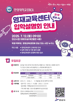 (경기=NSP통신) 김병관 기자 = 경기 안산시(시장 이민근)는 오는 12일 ‘한양대학교 ERICA 영재교육센터’ 입학설명회를 개최한다.