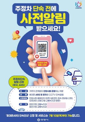 (경기=NSP통신) 김해종 기자 = 경기 안양시(시장 최대호)가 10일부터 관내 불법주정차 차량에 대해 단속 전에 문자와 함께 전화로 이동 및 단속 대상임을 안내하는 서비스(문자·전화 사전알림)를 제공한다.