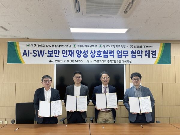 (경북=NSP통신) 김대원 기자 = 대구대학교(총장 박순진)가 사이버보안 전문기업 티오리한국(대표 박세준)과 손잡고 인공지능(AI), 소프트웨어(SW), 사이버보안 분야의 핵심 인재 양성을 위한 산학 협력에 나섰다.