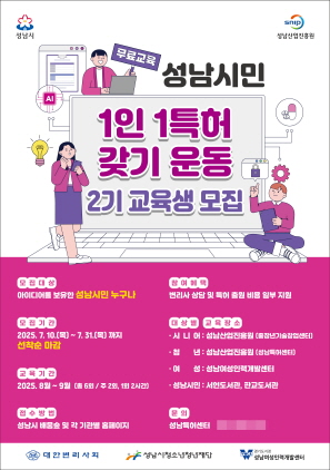 ‘1인 1특허 갖기 운동’은 성남시민이라면 누구나 참여할 수 있으며 특허 기초 교육부터 아이디어 고도화, 전문가 컨설팅, 특허 출원 절차 안내까지 전 과정을 지원하는 프로그램이다.