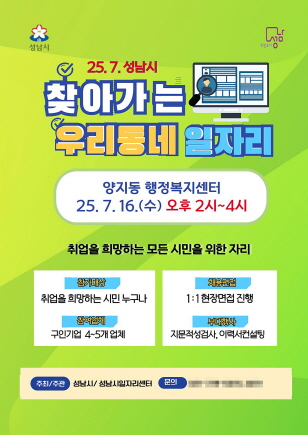 (경기=NSP통신) 김병관 기자 = 경기 성남시(시장 신상진)는 오는 16일 오후 2시부터 4시까지 양지동 행정복지센터 4층 다목적실에서 ‘찾아가는 우리동네 일자리’ 채용행사를 개최한다.