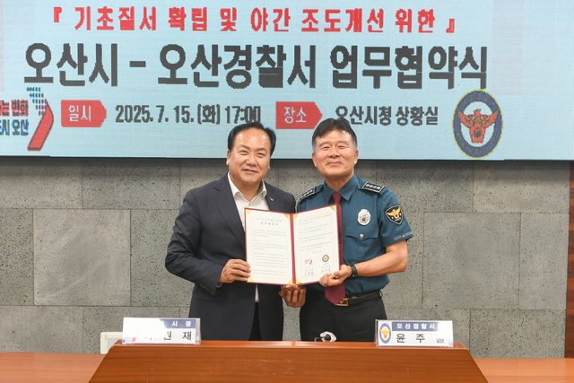 시와 오산경찰서(서장 윤주철)는 15일 시청 상황실에서 ‘야간 조도 개선 업무협약’을 체결하고 어두운 골목길과 범죄 취약지역의 조도를 집중 개선해 범죄를 예방하고 시민 불안을 해소하기로 했다.