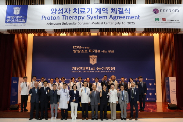(경북=NSP통신) 김대원 기자 = 계명대학교 동산의료원(의료원장 조치흠)이 16일 동산병원 행소대강당에서 ‘양성자 치료기 계약 체결식’을 갖고 차세대 정밀 암 치료 장비인 ‘양성자 치료기’ 도입에 박차를 가한다.