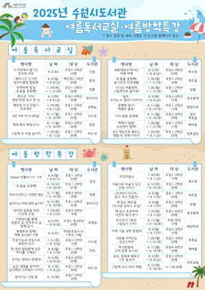 수원시도서관 관계자는 “여름방학을 맞아 수원시도서관에서 풍성한 프로그램을 운영한다”며 “아이들이 수원시도서관에서 책과 가까워지고 다양한 체험을 하며 유익한 시간을 갖길 바란다”고 말했다.