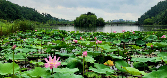 가야산을 병풍처럼 두른 와우생태호수공원은 2개의 아치형 목재다리로 연결된 ‘행운의 섬’을 중심으로 연꽃·부들 군락, 생태관찰섬, 맨발길, 산책로 등을 두루 갖췄다.