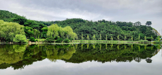 고요하고 투명한 수면에는 행운의 섬을 잇는 다리와 호수를 둘러싼 산, 나무 등이 아름다운 반영을 이뤄 그림 같은 풍경으로 호수공원을 찾은 이들의 시선을 사로잡는다.