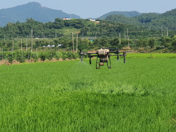 NSP통신-고흥군은 벼멸구 피해를 막기 위해 7월 하순~8월 상순 농약 방제를 당부했다 - 드론 예찰 (사진 = 고흥군)