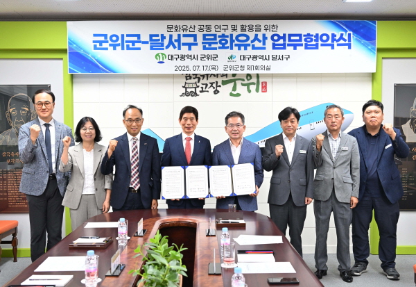 (경북=NSP통신) 김대원 기자 = 대구광역시 군위군(군수 김진열)은 지난 17일 군청 제1회의실에서 지역문화유산을 기반으로 한 관광자원 개발을 위해 달서구와 업무협약을 체결했다.