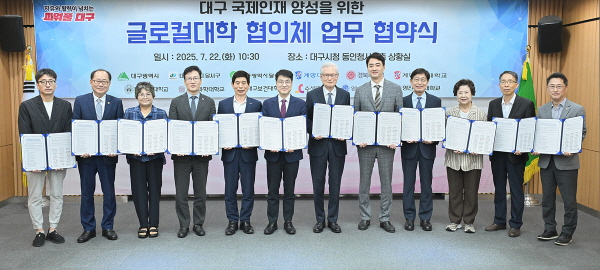 (경북=NSP통신) 김대원 기자 = 대구광역시는 22일 동인청사에서 달서구, 달성군, 계명대학교를 비롯한 지역 9개 대학과 함께 ‘대구 글로컬대학 협의체’ 업무협약(MOU)을 체결했다.