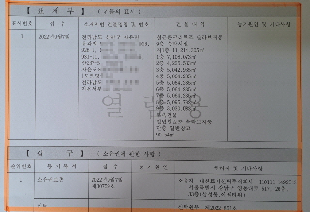 이후 22년 4월 토지 소유권자가 대한토지신탁주신회사로 변경되고 이어 9월에 리조트 건물 소유권자로 대한토지신탁이 등재된다.