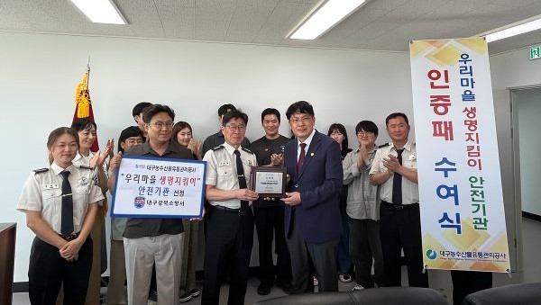 NSP통신-대구농수산물유통관리공사는 지난 24일 대구소방안전본부로부터 우리마을 생명지킴이 안전기관으로 공식 지정돼 인증패를 수여 받았다.(사진=대구농수산물유통관리공사)