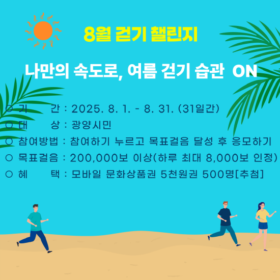 (전남=NSP통신) 김성철 기자 = 광양시는 오는 8월 1일~31일까지 한 달간 모바일 걷기 앱 ‘워크온(WalkOn)’에서 ‘나만의 속도로, 여름 걷기 습관 ON’ 8월 걷기 챌린지를 운영한다고 밝혔다.
