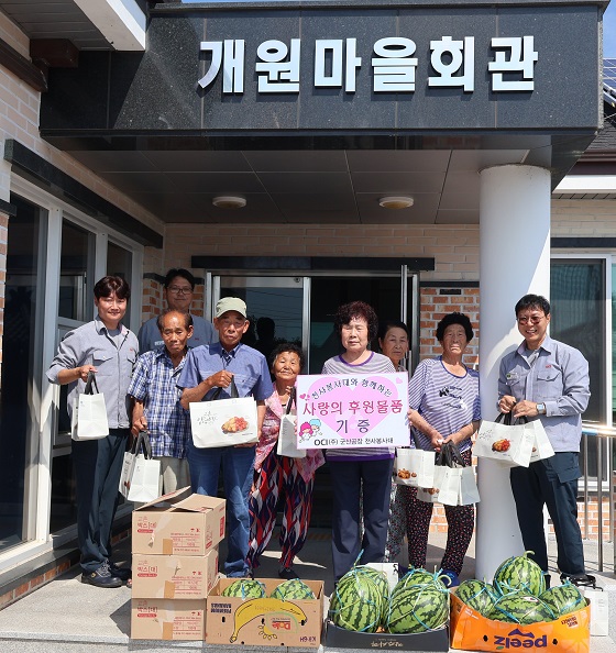이날 나눔 행사는 OCI 군산공장과 자매결연을 맺은 5개마을(해이,장전,개원,미창,서흥) 통장들이 참석한 가운데 이뤄졌으며, 이들 마을에 복날을 맞아 통닭과 시원한 수박 등의 과일을 후원했다.