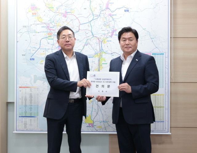 NSP통신-임병택 시흥시장(오른쪽)이 최용택 LH 광명시흥사업본부장에게 건의문을 전달하고 있다. (사진 = 시흥시)