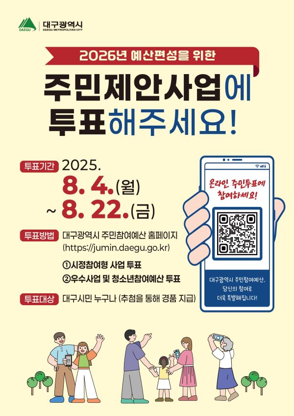 (대구=NSP통신) 장석 기자 = 대구시는 2026년 주민참여예산사업 선정을 위해 오는 4일부터 22일까지 3주간 온라인 시민 투표를 진행한다.