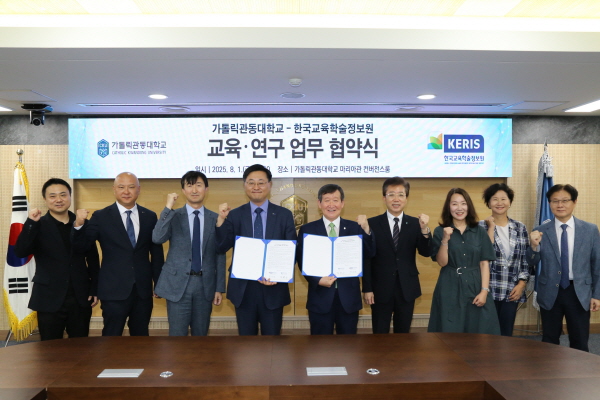 (경북=NSP통신) 김대원 기자 = 한국교육학술정보원(원장 정제영, 이하 케리스)와 가톨릭관동대학교(총장 김용승)은 지난 1일 교육 및 연구 분야의 협력 강화를 위한 업무 협약을 체결하고 교육데이터 기반의 혁신적 고등교육 생태계 조성을 위해 전략적 협력관계를 구축하기로 했다.