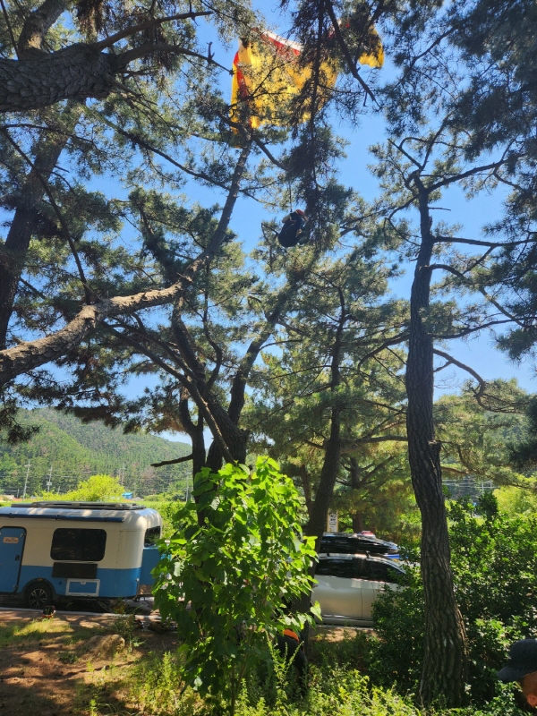 4일 포항북부소방서에 따르면 포항시 북구 칠포리 인근에서 패러글라이딩을 타던 60대 남성 A씨가 착륙을 시도하다 고도조절 실수로 인해 10m 정도 높이의 나무에 걸려 119에 신고했다.