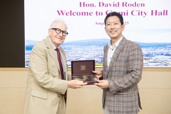 (경북=NSP통신) 조인호 기자 = 김장호 구미시장은 5일 시청 국제통상협력실에서 ‘데이비드 로든(David Roden) 경상북도 투자유치 홍보대사(이하 홍보대사)’를 접견하고 구미시 투자환경을 소개하며 협력을 요청했다.