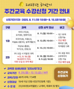 (경북=NSP통신) 김오현 기자 = 안동시 평생학습관은 오는 11일부터 2025년 하반기 주간교육 수강생을 모집한다.