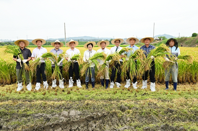 이는 올해 도내 첫 벼 수확으로 한경국립대 이원희 총장과 김경희 이천시장, 박명서 이천시의회 의장을 비롯해 농업관련단체 및 연구소 관계자들이 참석한 가운데 열렸다.
