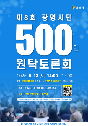 시는 9월 13일 광명시민체육관에서 시민과 함께 지역의 미래를 그리는 ‘제8회 광명시민 500인 원탁토론회’를 개최한다.