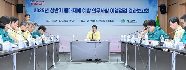 (대구=NSP통신) 장석 기자 = 대구시는 지난 12일 동인청사 2층 상황실에서 중대재해 예방 및 안전관리 강화를 위해 ‘중대재해 예방 의무사항 이행점검 결과보고회’를 개최했다.