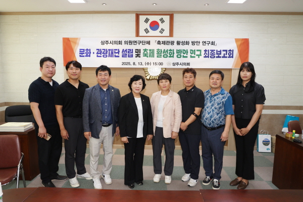 이번 최종보고회는 의원연구단체 회원들과 관계 공무원, 학술연구용역 업체 등 10여 명이 참여해 ▲상주시 맟춤형 지역 축제 기획안 ▲상주형 문화관광재단 설립 모델 제안 대한 의견을 청취하고 토론하는 시간을 가졌다.