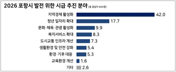 조사 결과 포항시민들이 가장 시급하게 해결해야 할 지역 정책과제로 꼽은 것은 ‘지역경제 활성화’로 나타났다.