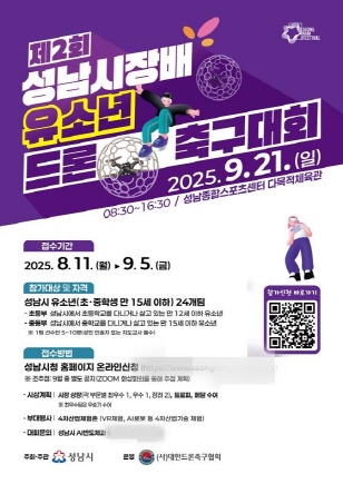 (경기=NSP통신) 김병관 기자 = 경기 성남시(시장 신상진)는 다음달 21일 성남종합스포츠센터 다목적체육관에서 열리는 ‘제2회 성남시장배 유소년 드론 축구대회’ 참가팀을 9월 5일까지 모집한다.