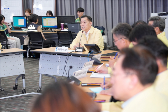 NSP통신-18일 이재준 수원시장(가운데)이 수원시 전시종합상황실에서 2025년 을지연습 최초 상황보고회를 주재하고 있다. (사진 = 수원시)