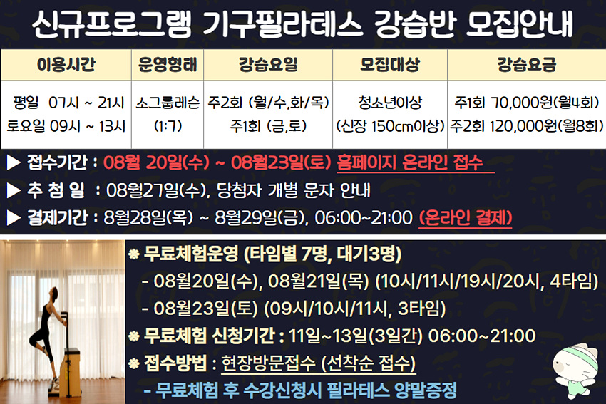 기구필라테스는 리포머 등 전문 장비를 활용해 코어 근육 강화, 자세 교정, 유연성 향상에 효과적이다. 이번 프로그램에서는 청소년 이상 시민을 대상으로 소그룹 레슨(1:7) 형태로 진행한다.