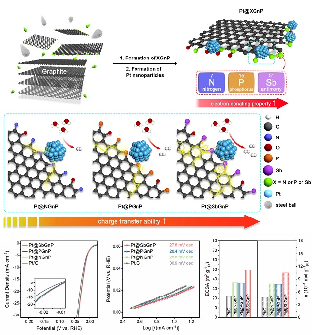 양성자교환막 수전해(PEMWE) 기술은 높은 효율성을 갖췄지만 고가의 백금(Pt) 촉매와 산성 환경에서의 불안정성이 상용화 걸림돌로 지적돼 왔으며 연구팀은 15족 원소인 질소(N), 인(P), 안티몬(Sb)을 각각 도핑한 그래피틱 나노플레이트(XGnPs, X = N, P, Sb)를 지지체로 활용해 촉매 활성도와 안정성을 동시에 향상시키는 데 성공하고 분석 결과 Sb가 도핑된 Pt@SbGnP 촉매가 가장 우수한 성능을 보이는 것을 확인했다.