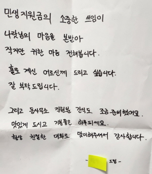 이번에 전달된 후원물품은 △백미 10kg 2포 △사이다 1박스 △초코파이 1상자다. 기부자는 대리인을 통해 조용히 기부 의사를 전하며 “민생지원금의 소중한 쓰임을, 작지만 귀한 마음으로 전해 봅니다”라는 글귀가 담긴 손 편지를 함께 전달했다.