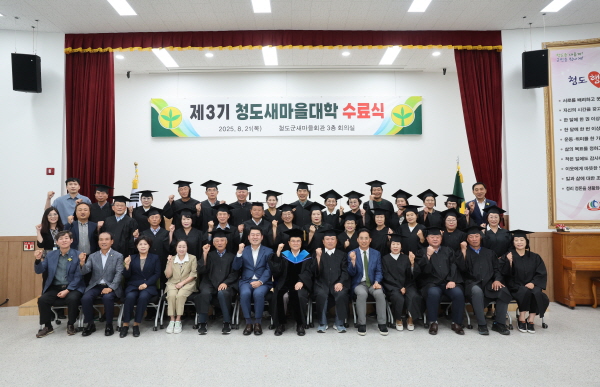 (경북=NSP통신) 김대원 기자 = 청도군(군수 김하수)은 지난 21일 청도군 새마을회관에서 김하수 청도군수, 전종율 청도군의회 의장, 기화서 청도우리정신문화재단 대표이사, 송건섭 대구대 새마을운동연구센터장 등 70여 명이 참석한 가운데 ‘2025년 제3기 청도새마을대학’ 수료식을 개최했다.
