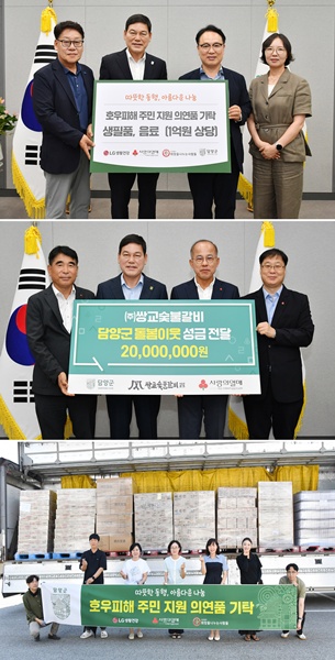(전남=NSP통신) 김용재 기자 = 담양군에 최근 집중호우로 피해를 본 주민들을 돕기 위한 성금과 물품 기탁이 잇따르고 있다.