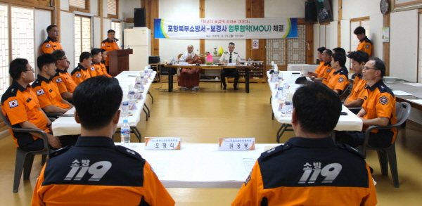 (경북=NSP통신) 조석현 기자 = 포항북부소방서(서장 김장수)는 25일 보경사에서 소방서장과 주지스님 등 총 30여명이 참석한 가운데 업무 협약(MOU)식을 진행했다.